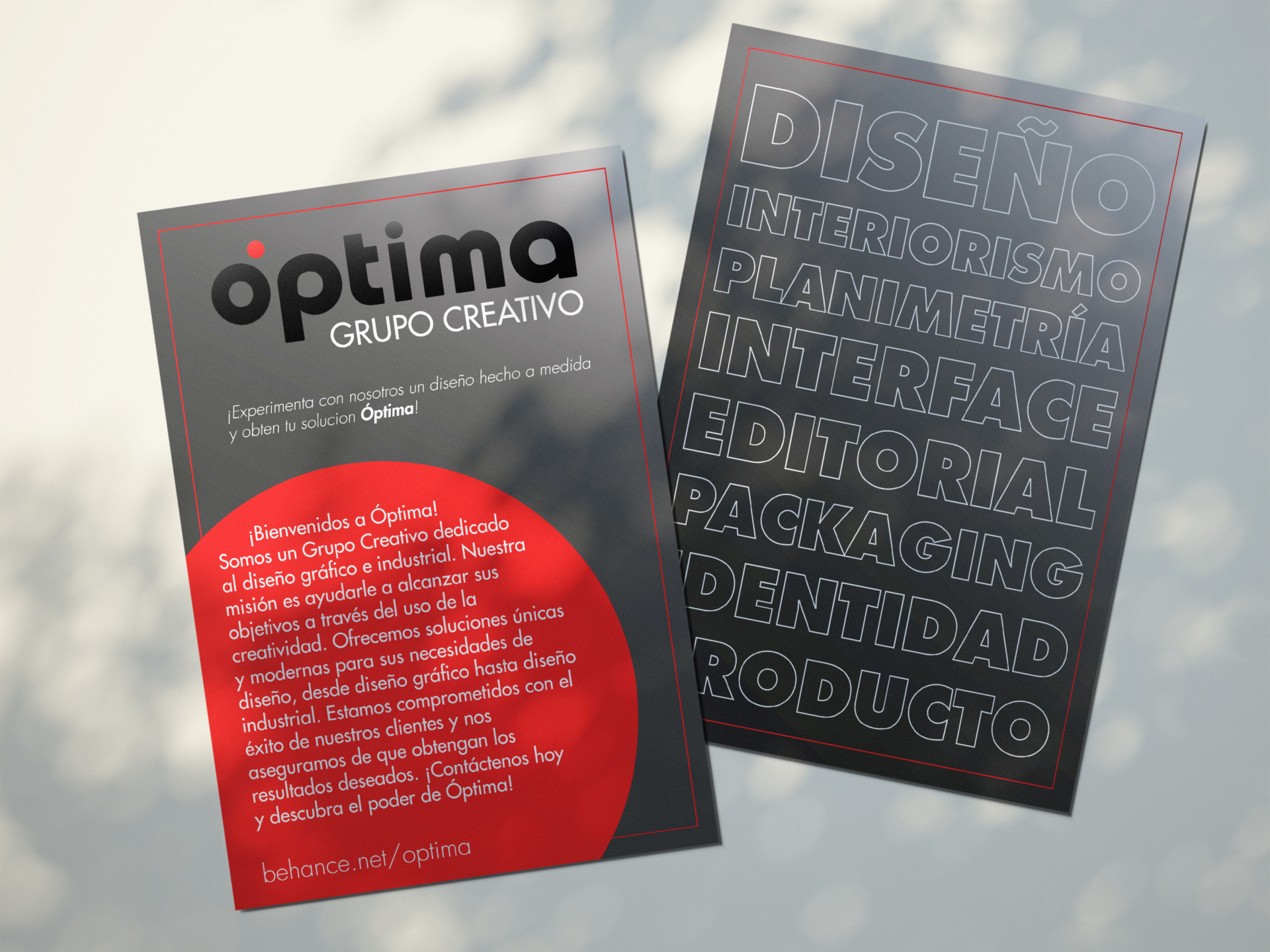 Proyecto de diseño de identidad y campaña gráfica para el grupo de diseño Óptima. Creación de un logo distintivo y memorable que refleje la creatividad y profesionalismo del grupo. Desarrollo de una paleta de colores que transmita confianza y originalidad. Diseño de material promocional, como folletos y banners, que destaquen los servicios ofrecidos por Óptima. Campaña gráfica enfocada en resaltar la calidad y la innovación en el diseño.